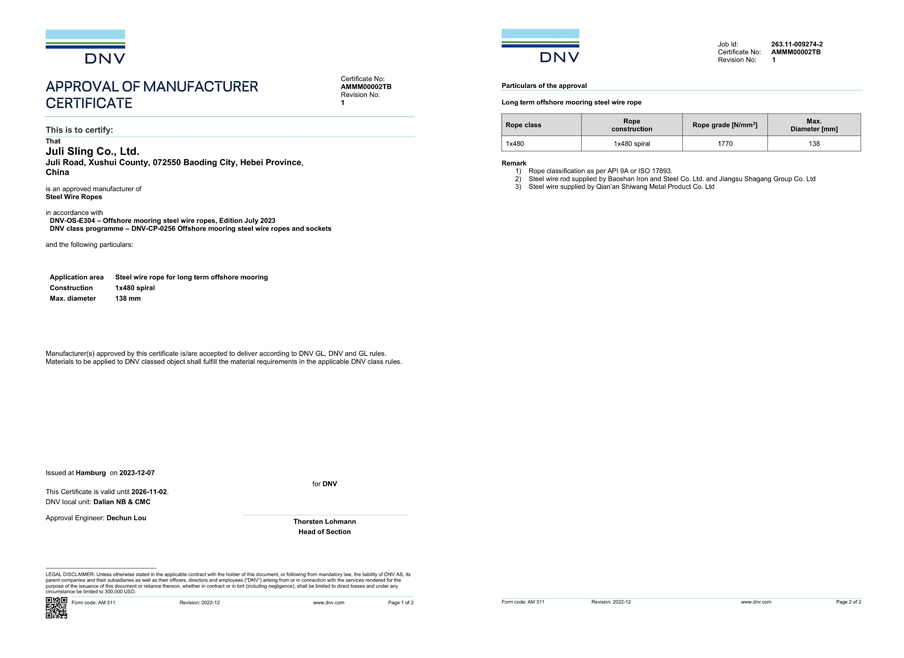 2020年11月,巨力索具获得了永远系泊用单股涂塑钢丝绳的DNV·GL工场承认证书,成为国际首家经由进程该类钢丝绳DNV·GL工场承认的厂家。