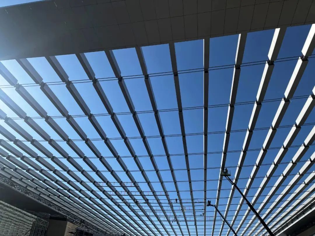 就拿高难度的拉索装置来讲,矢高约3.5米的超大弧形悬索钢屋盖,每榀桁架起吊后,须要找到最适合的角度做成倾斜状况。此中最长的桁架,持续跨度可达120米摆布。大屋面由“双向钢桁架+跨中拉索布局”构成,中心地区110米全悬空的悬链态由两侧边桁架及中心36根直径为70毫米的不锈钢拉索构成,施工牵引张拉、精度、温度、双索的歪曲偏转是无可躲避的困难。